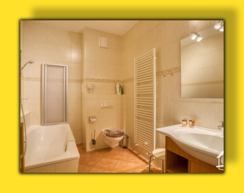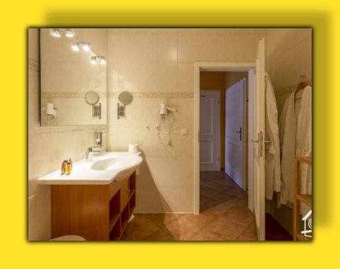 Luxuriöses Bad u.a. mit Badewanne inklusive Duschvorrichtung, eigener kleiner Kneipp-Anlage, Handtuchheizung, Vergrößerungsspiegel und Fön.