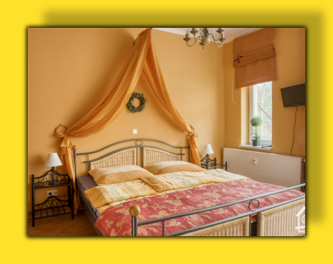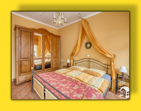 Extra hohe Decken, ein großer rustikaler Kleiderschrank sowie spezielle Stukleisten an der Decke sorgen dabei für eine ganz besondere Atmosphäre.