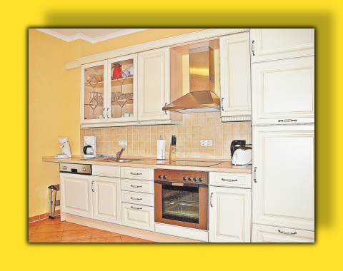 Luxuriöse Einbauküche im Landhausstil mit unter anderem Geschirrspülmaschine, Mikrowelle, Backofen, E-Herd mit Cerankochfeld, Kühlschrank mit Gefrierfach, Toaster, Wasserkocher, Mixer, Kaffeemaschine, Senseo-Kaffepadautomat (zur Zubereitung von verschiedenen Kaffee-, Cappuccino- und Kakaovariationen) und Kaffeevollautomat (mit eigenem Mahlwerk für ganze Bohnen und Milchaufschäumer, u. a. für Latte Macchiato und Espresso), etc.