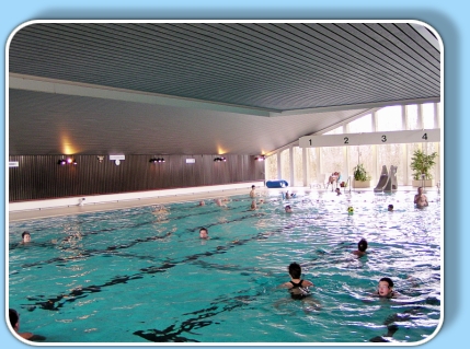 Damit das Schwimmbad die anderen Gäste nicht stört, ist es in einem eigenständigen ''Schwimmbad-Gebäude'' untergebracht. Die Schwimmhalle befindet sich direkt neben dem Hauptgebäude, nur wenige Schritte von der Fahrstuhltür entfernt. Da das Schwimmbad quasi direkt nebenan liegt, können Sie sich bereits in Ihrer Ferienwohnung umziehen und nur mit einem Bademantel bekleidet bequem ins Schwimmbad gehen !!!